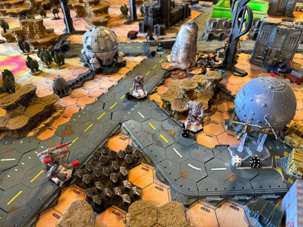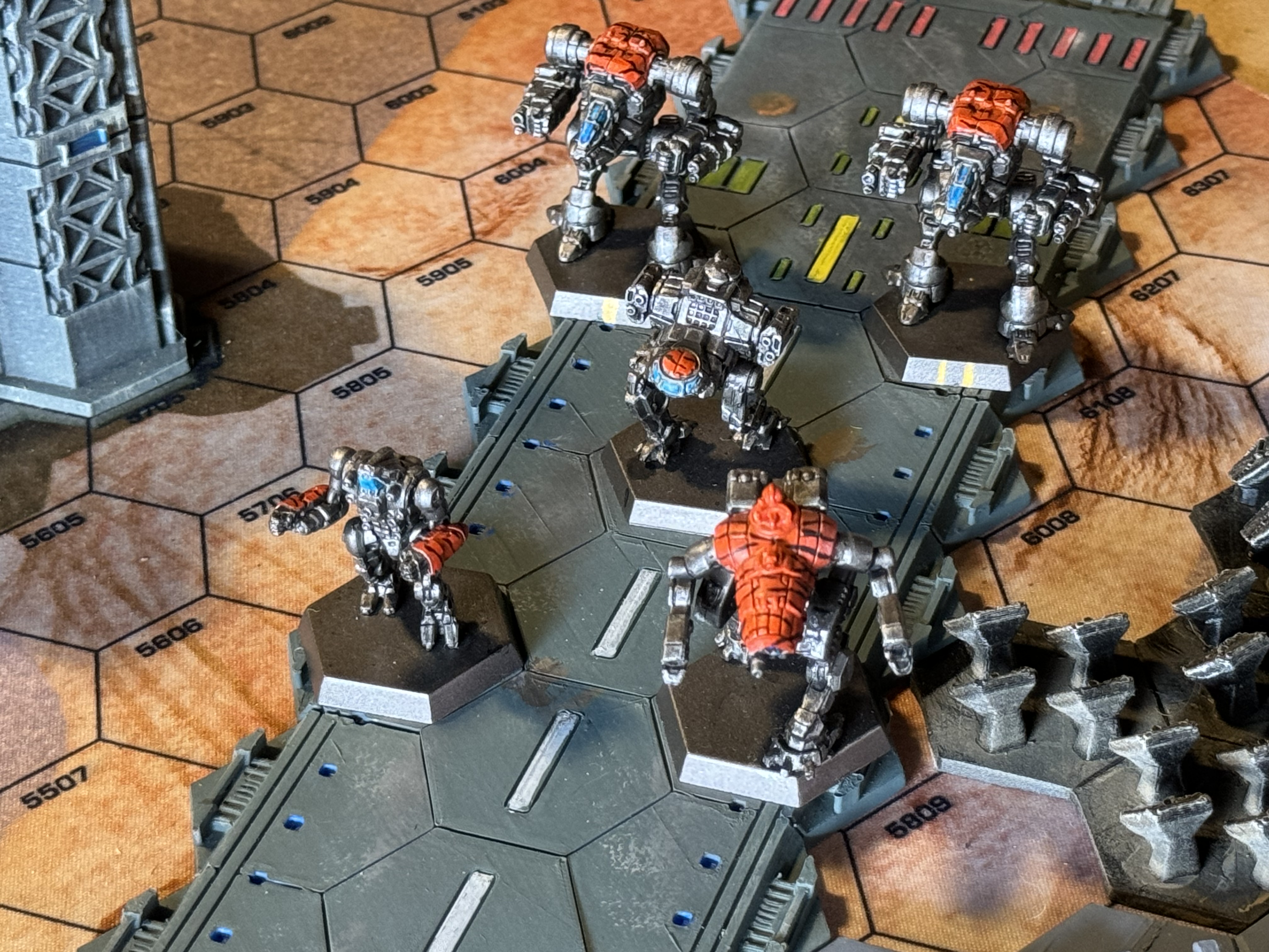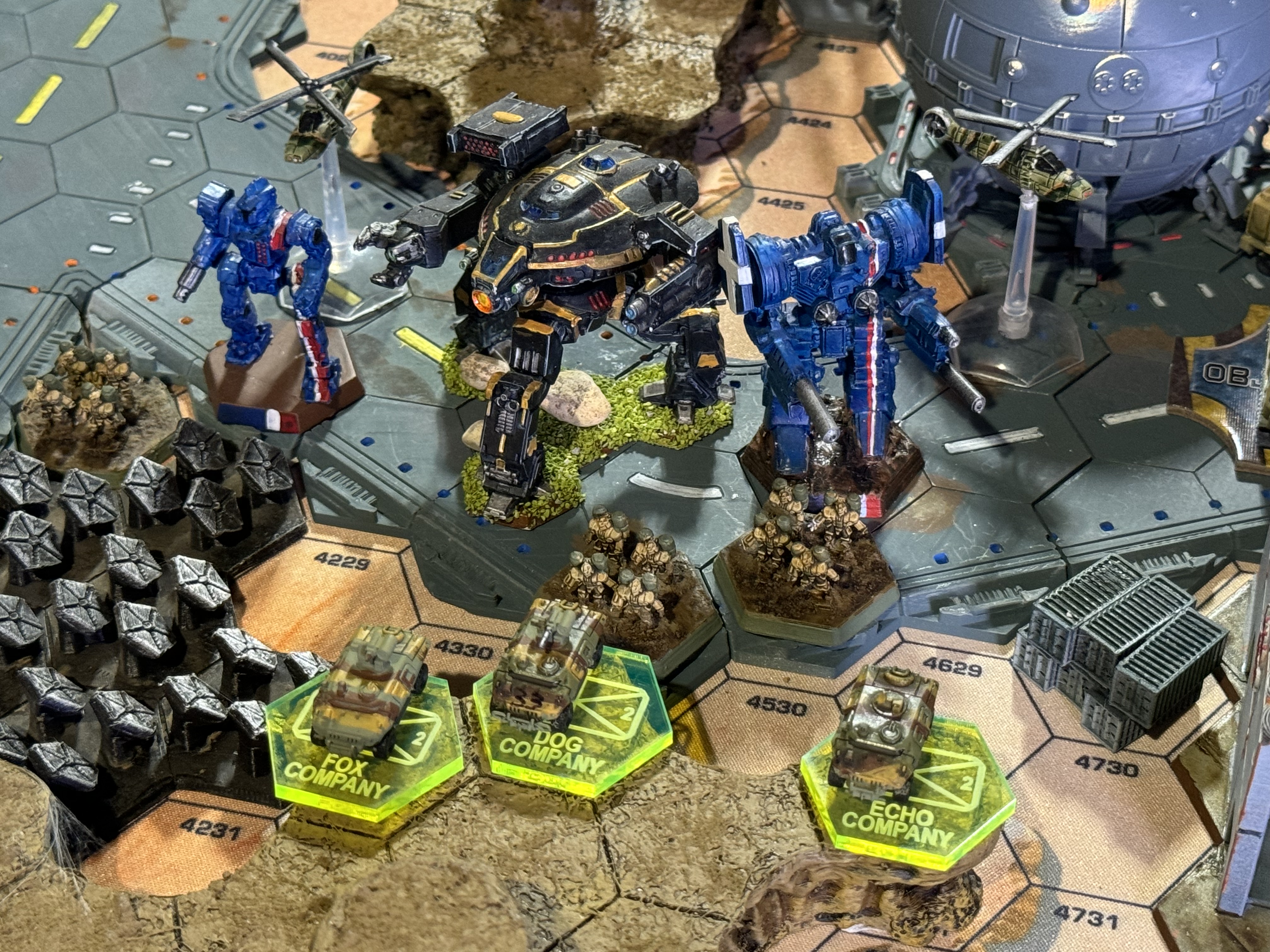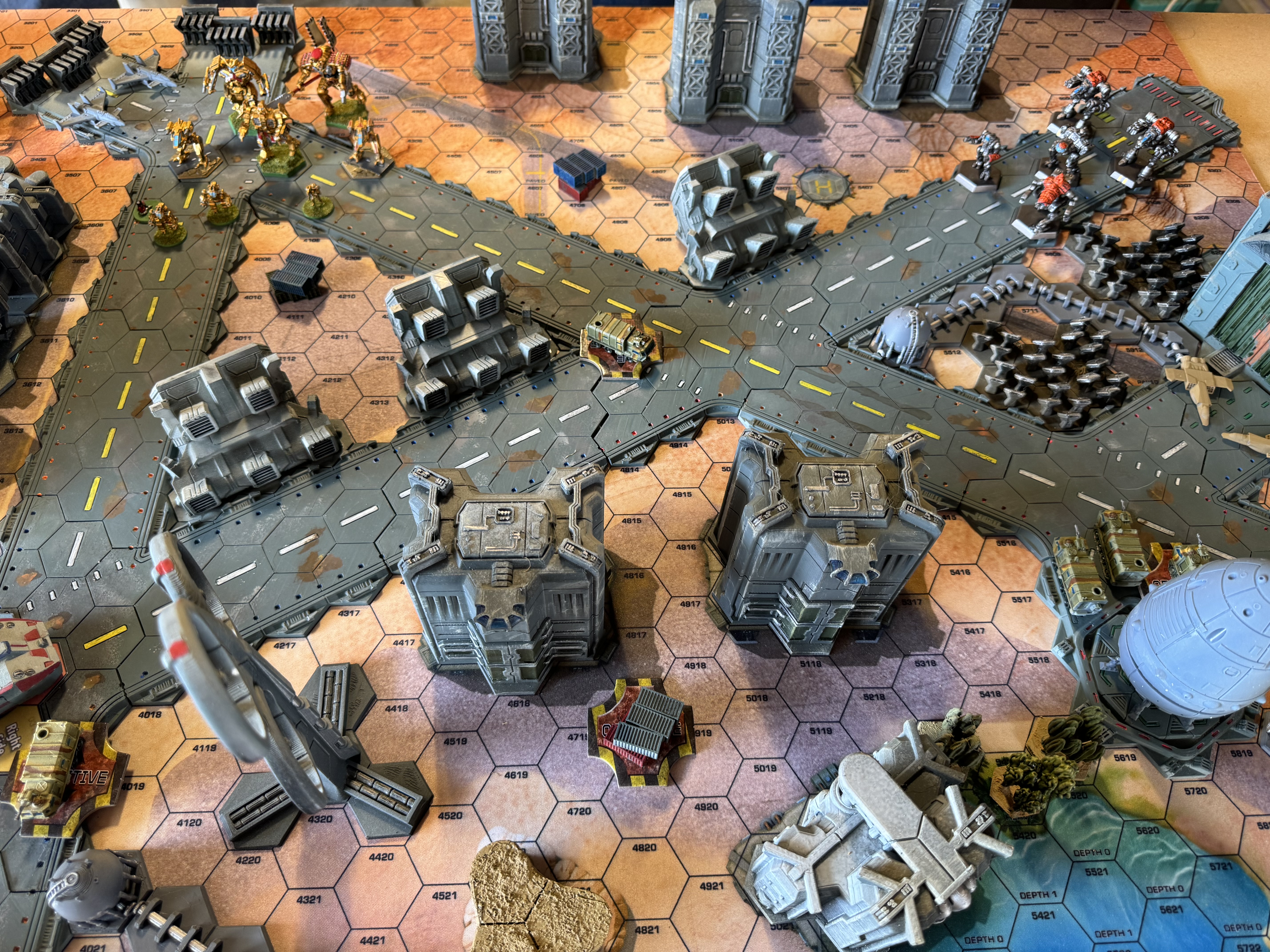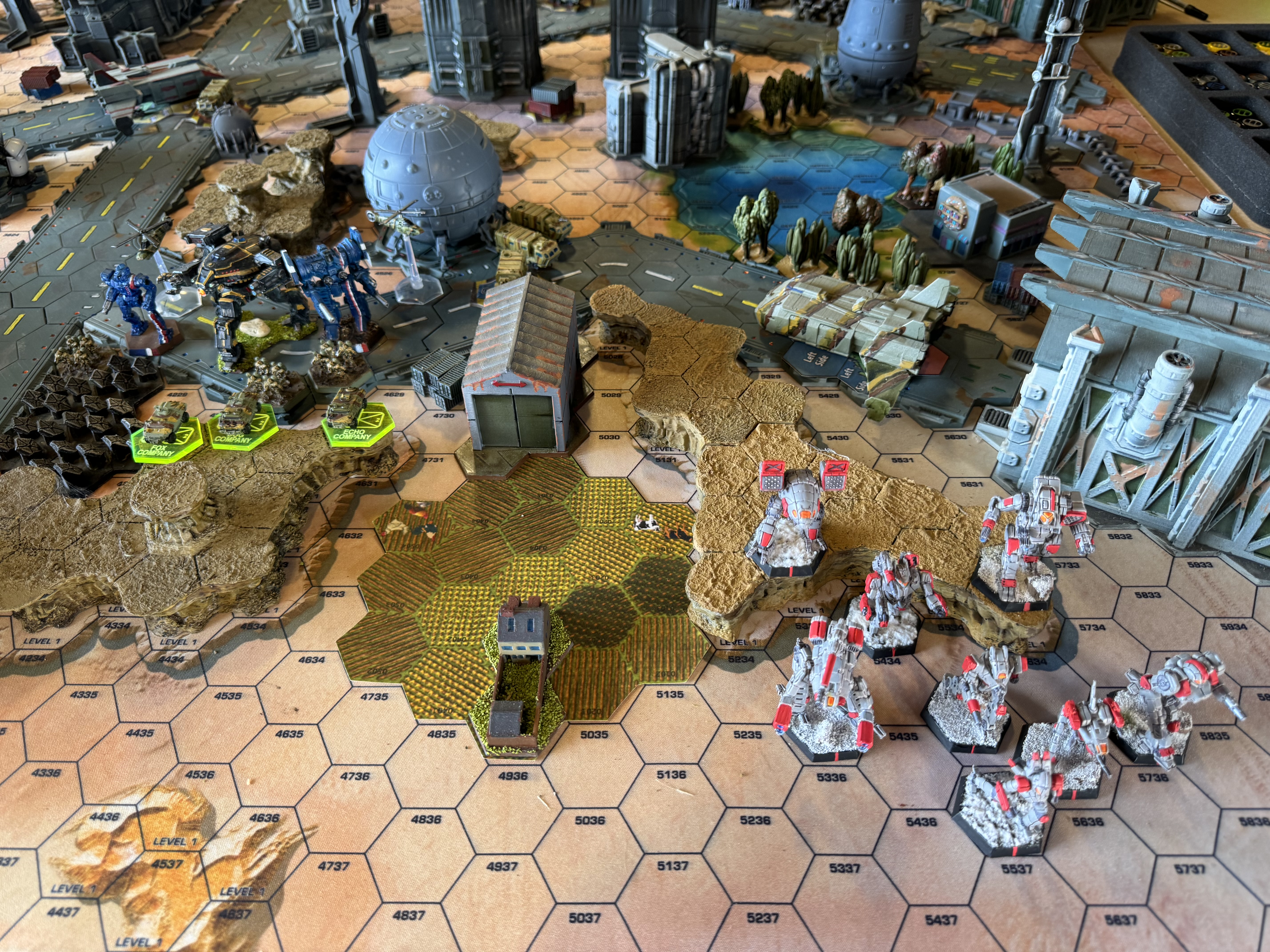 Had 5 objective markers, 3 along the middle and 1 10 hexes from each deployment edge. The objective was to have the more BV of units within 3 hexes of the objective with a ground unit (not VTOL’s or Shutdown, KO’s, Crippled or Destroyed). Each objective scored 1 VP in the end phase.